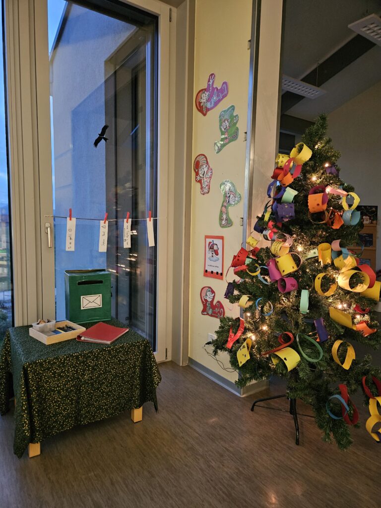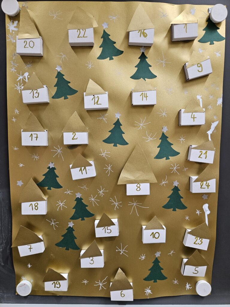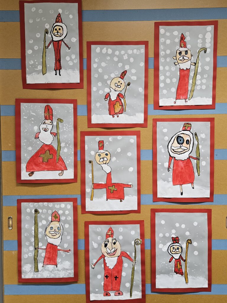 Notre classe glisse pas à pas vers St Nicolas et Noël. Nous avons préparé un calendrier de l’Avent qui nous réserve chaque jour une surprise. Nous fabriquons des guirlandes pour décorer notre sapin et écrivons des cartes à nos copains.